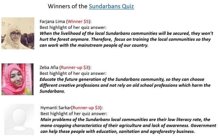 The winner of this quiz is Farjana Lima who won $5 and runner-ups are Zeba Afia and Hymanti Sarkar who won $3 respectively.